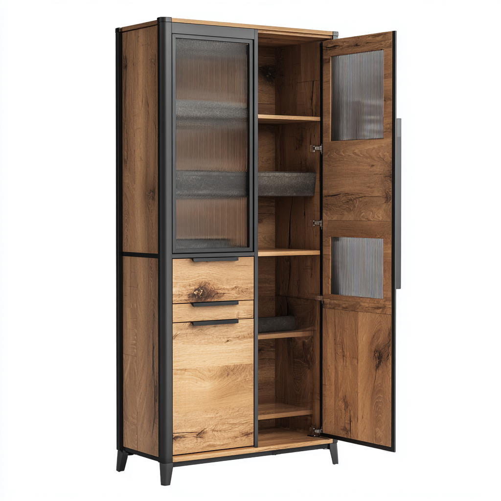Vetrina con ante e cassetti in legno e vetro 90x45x190 cm - Marrone-Nero - stile moderno