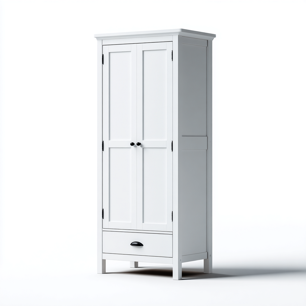 La struttura e realizzata in pannelli MDF con verniciatura bianca uniforme che garantisce un aspetto pulito e luminoso. Le ante e il cassetto inferiore sono dotati di maniglie resistenti che assicurano un utilizzo quotidiano agevole.