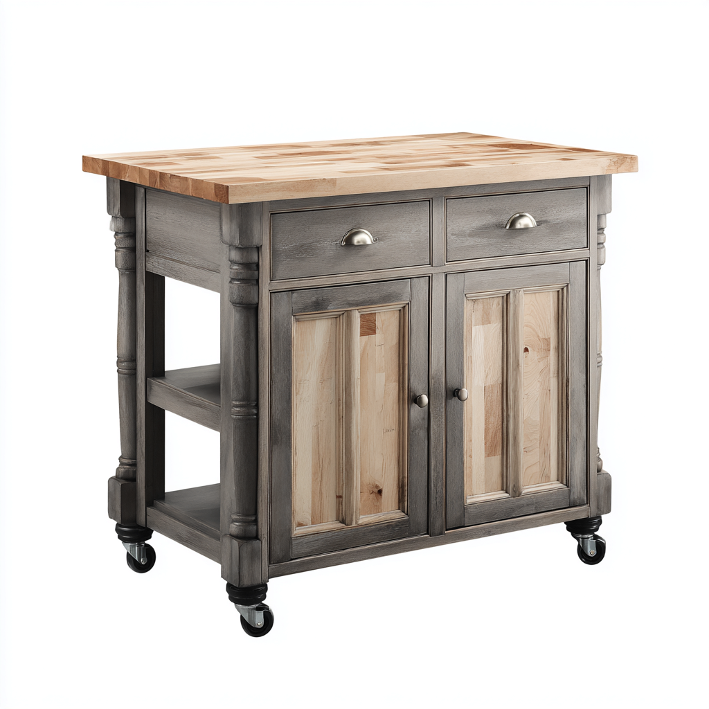 La struttura è realizzata in legno con finitura di colore grigio, abbinata a un piano superiore in tonalità naturale. La lavorazione curata garantisce stabilità, resistenza e un aspetto equilibrato facilmente integrabile in diversi stili di cucina.