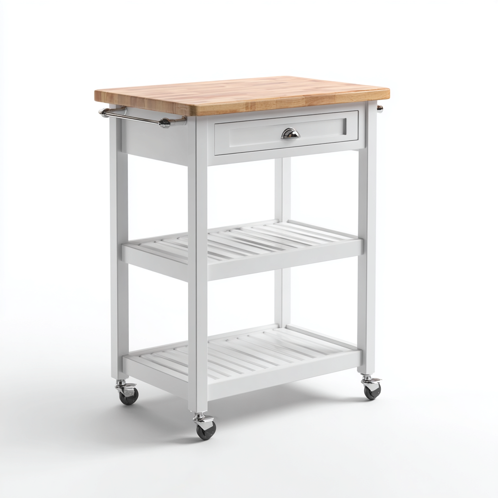 Isola da cucina compatta progettata per offrire una superficie di lavoro pratica e una soluzione di appoggio funzionale in ambienti cucina di dimensioni contenute. La struttura mobile consente un utilizzo flessibile nello spazio domestico.