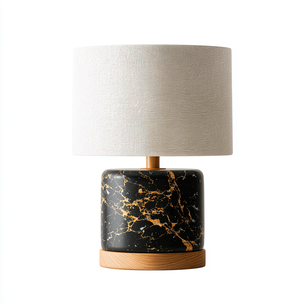 Base realizzata in materiale composito con finitura nera e venature decorative color oro, abbinata a una base inferiore con effetto legno. Paralume in tessuto chiaro che diffonde una luce morbida e piacevole.