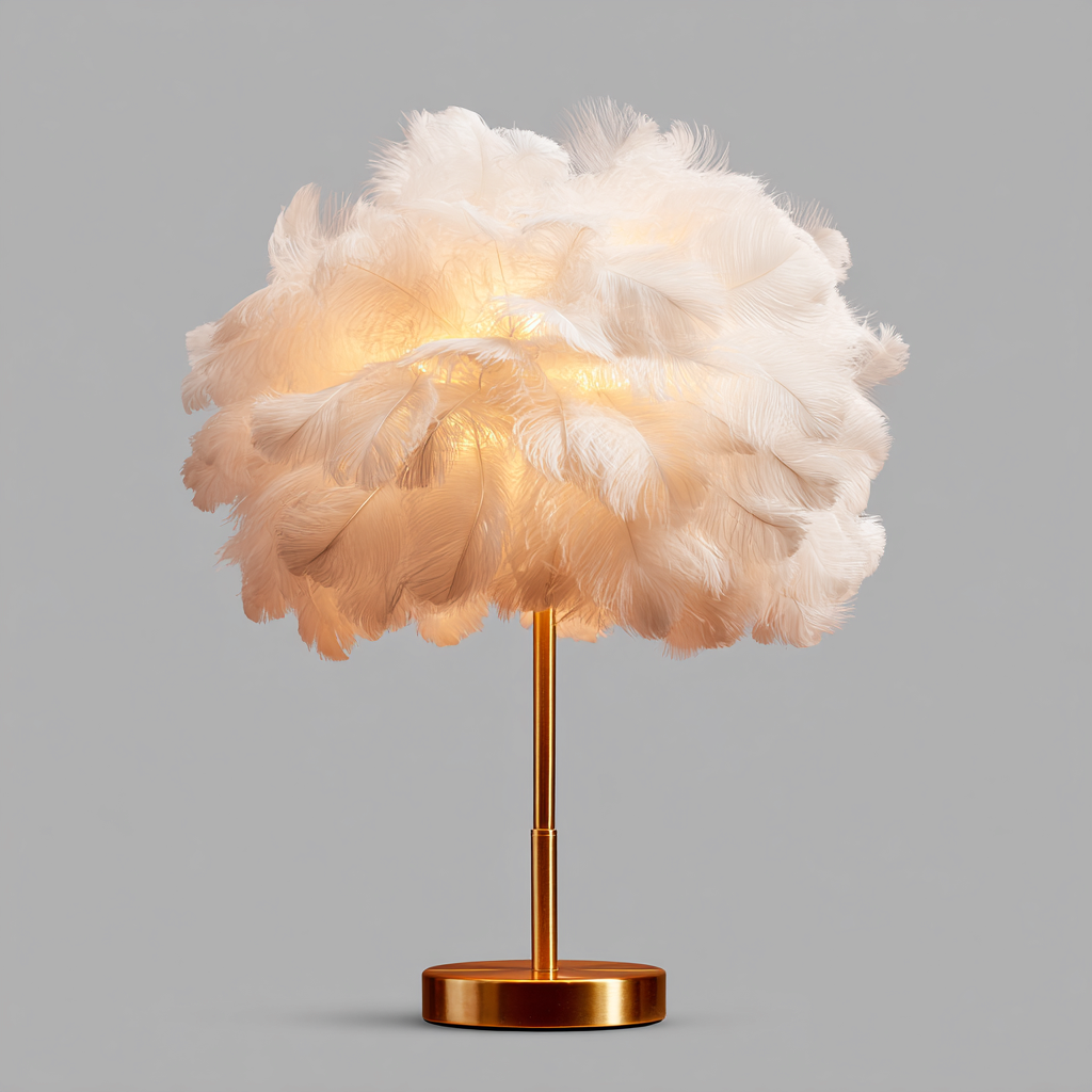 Paralume realizzato con piume decorative di colore bianco che diffondono la luce in modo morbido. Struttura e base in metallo con finitura color oro, stabile e rifinita con cura.