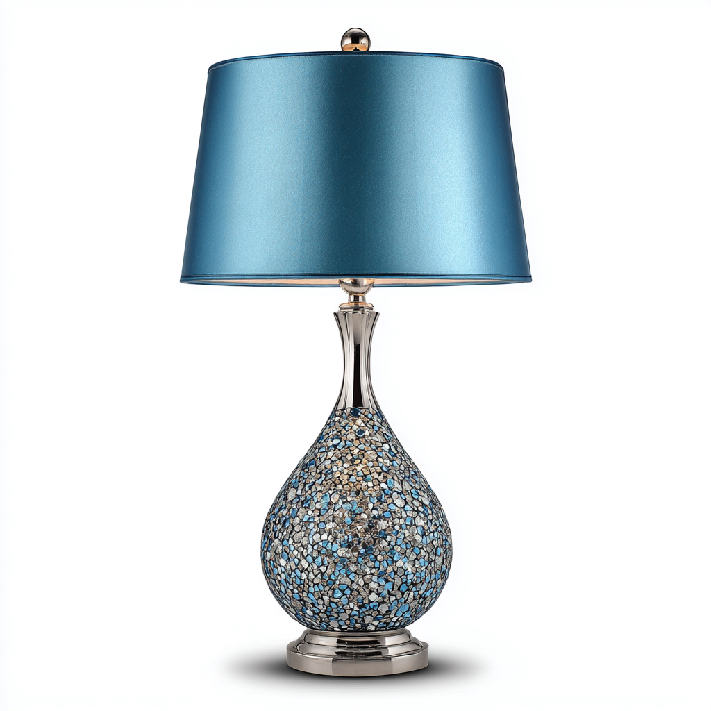Base decorativa con finitura lucida e dettagli cromati abbinata a paralume in tonalità blu. La lavorazione accurata garantisce stabilità e qualità estetica.