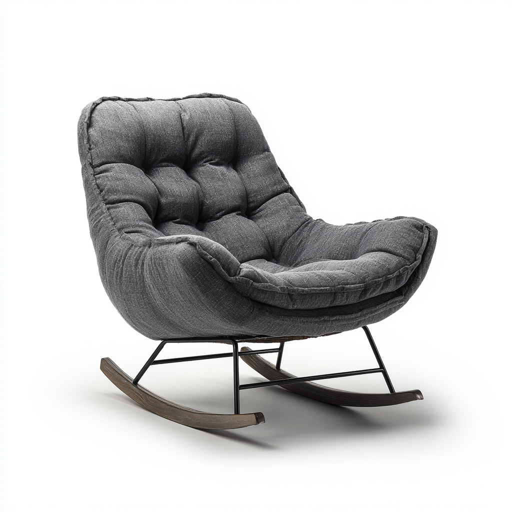 Rivestimento in tessuto imbottito di colore grigio, con cuciture evidenti che valorizzano la forma ergonomica. La struttura è composta da una base in metallo con pattini in legno, studiata per garantire stabilità e un movimento di dondolo fluido.