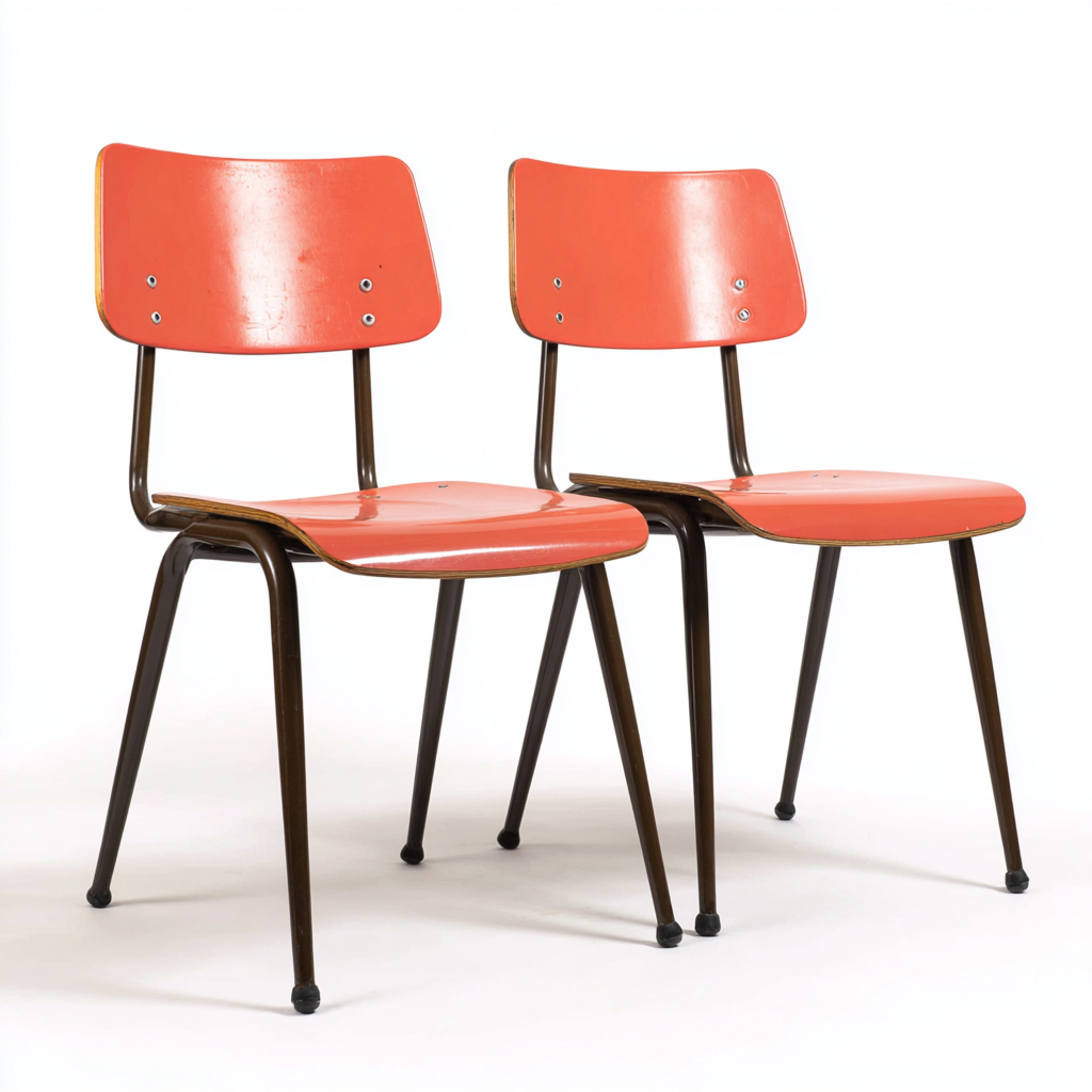Seduta e schienale realizzati in legno verniciato di colore arancione abbinati a struttura in metallo con finitura marrone. La combinazione dei materiali garantisce stabilita e una buona resistenza nel tempo.