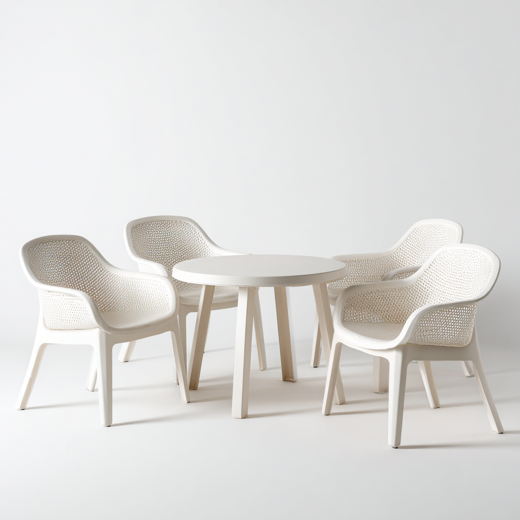 Sedie e tavolo realizzati in plastica resistente di colore bianco con superfici lisce e struttura solida. Il materiale e progettato per l utilizzo outdoor garantendo stabilita e una buona durata nel tempo.