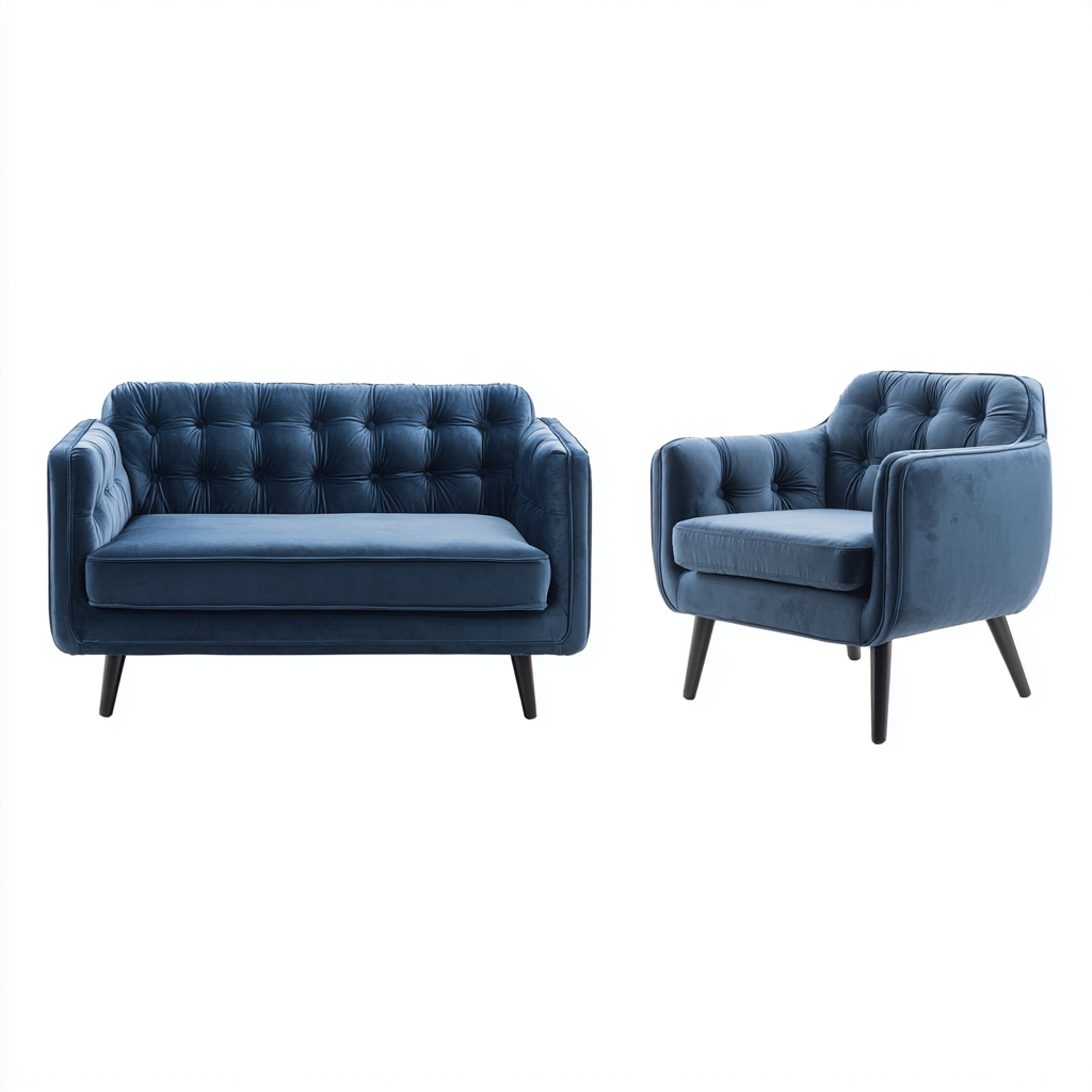 Set di divani dal design moderno e compatto, composto da un divano a due posti e una poltrona coordinata. Le linee morbide e la lavorazione con impunture decorative rendono questo set ideale per arredare con eleganza soggiorni di dimensioni medie o ridotte.