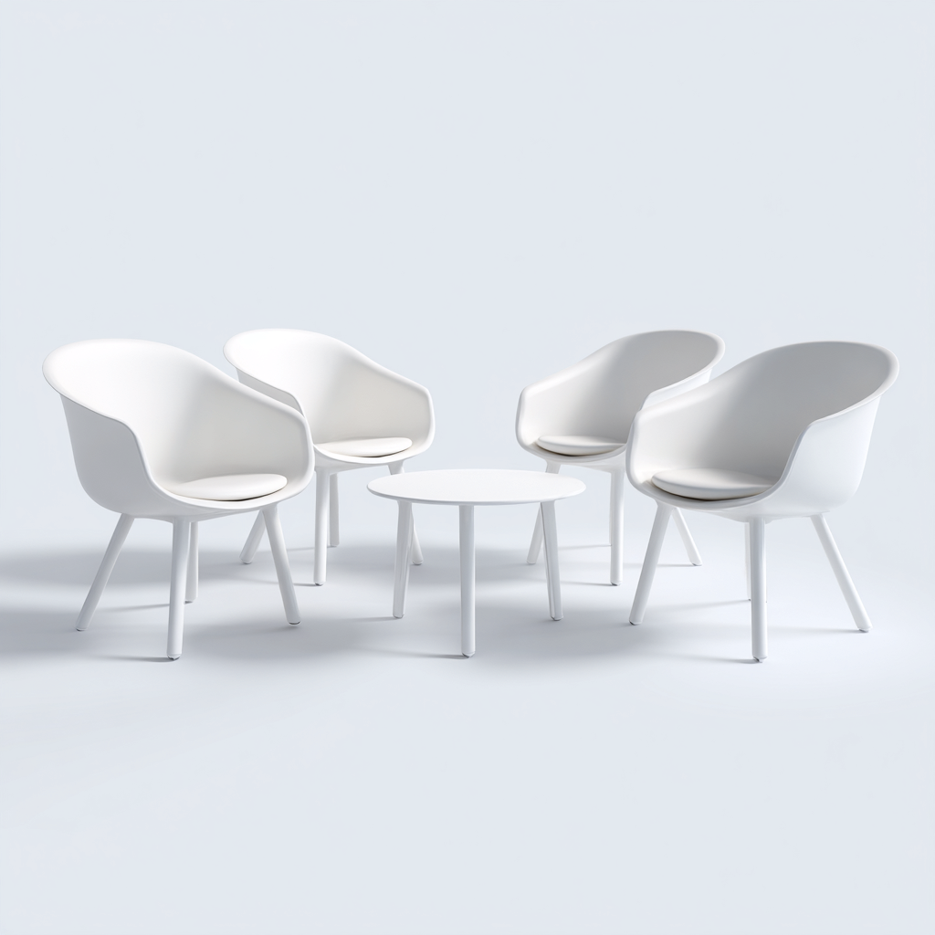 Le sedute sono realizzate in plastica resistente e presentano un cuscino integrato per un comfort maggiore. Il tavolino rotondo è anch'esso in plastica, stabile e facile da pulire.
