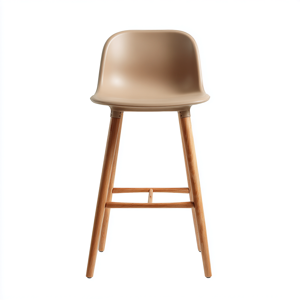 La seduta è realizzata in plastica con finitura beige dalla superficie liscia. La struttura è in legno naturale con venature visibili che donano calore visivo e un aspetto equilibrato.